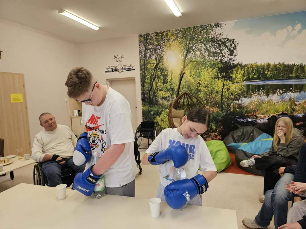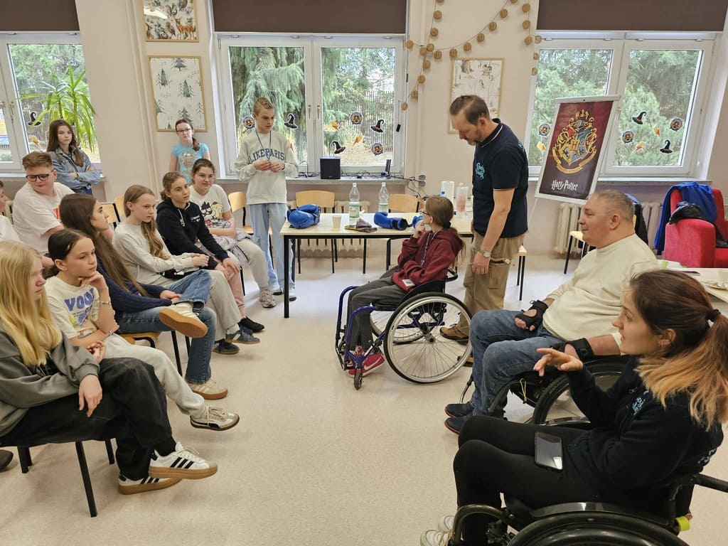 Podczas zajęć uczniowie mogli zobaczyć, jak wygląda codzienne funkcjonowanie osób z różnymi ograniczeniami. Proste czynności – zawiązanie butów, odkręcenie butelki wody, poruszanie się na wózku po klasie – nagle stały się wyzwaniem i pokazały, ile cierpliwości i determinacji wymaga każdy dzień.